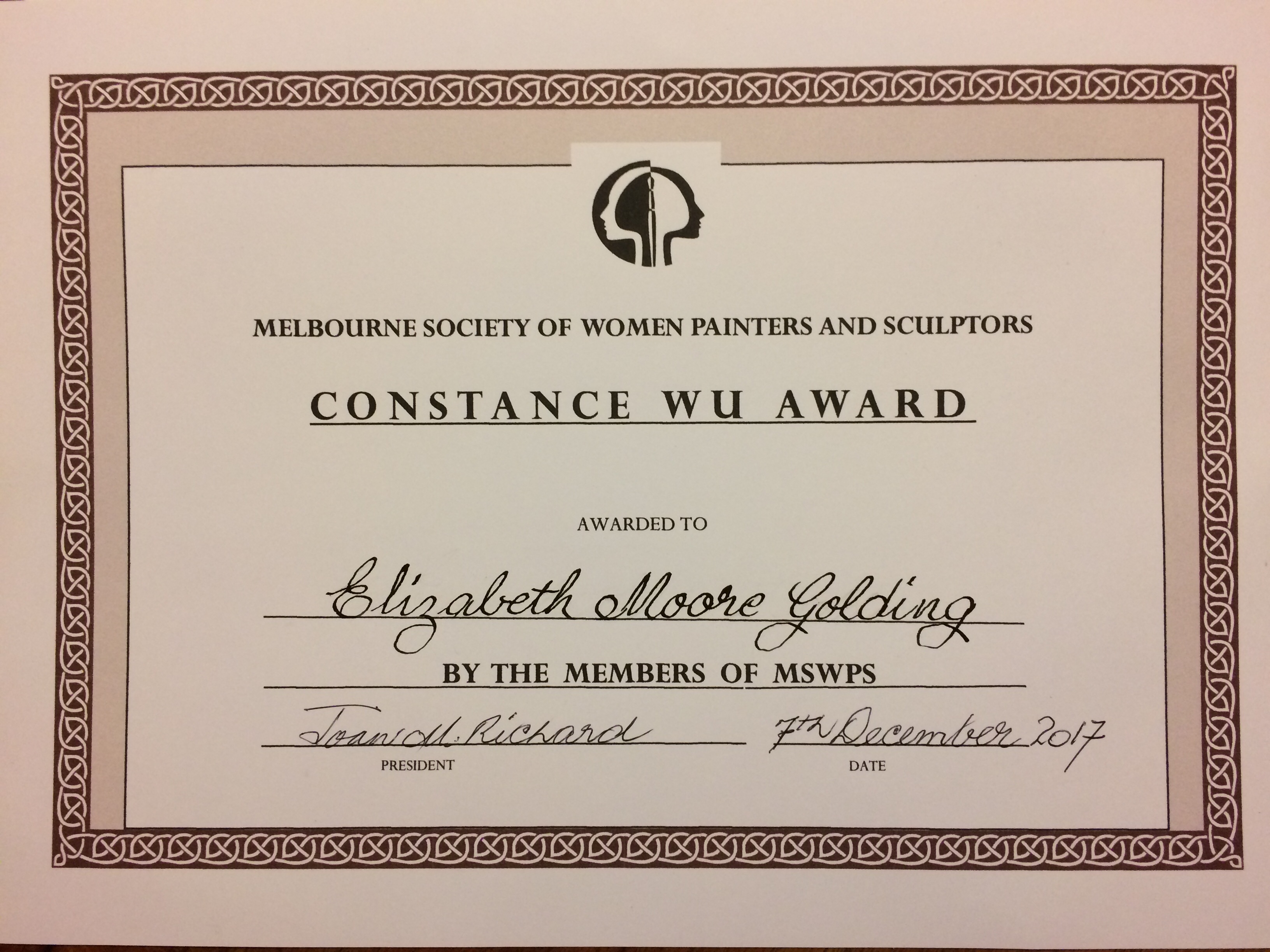 Elizabeth Moore Golding for ‘Lost in Thought’ and Sue Jarvis for ‘9am Swanston Street’. They will be presented with this award donated by Carolyn Yong in memory of her mother at the Christmas Lunch.