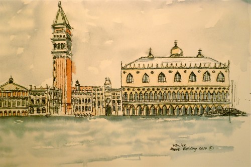 I did this pen and wash whilst sitting on the steps of the church of San Giorgio Maggiore on the island of the same name in Venice. It is the same place that Canaletto did paintings from, although he probably painted from the bell tower. I was looking for this spot when we were on a vaporetto and leapt off at this stop! We didn’t know how beautiful this church was inside, but Kevin McLeod did and it is featured in his journey to Europe.