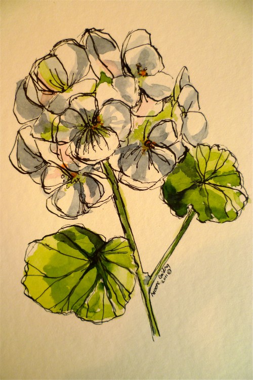 Posted in Uncategorized, tagged flowers, Geranium, pen and wash, white, white flowers, white geranium, white painting on November 4, 2012| 1 Comment »